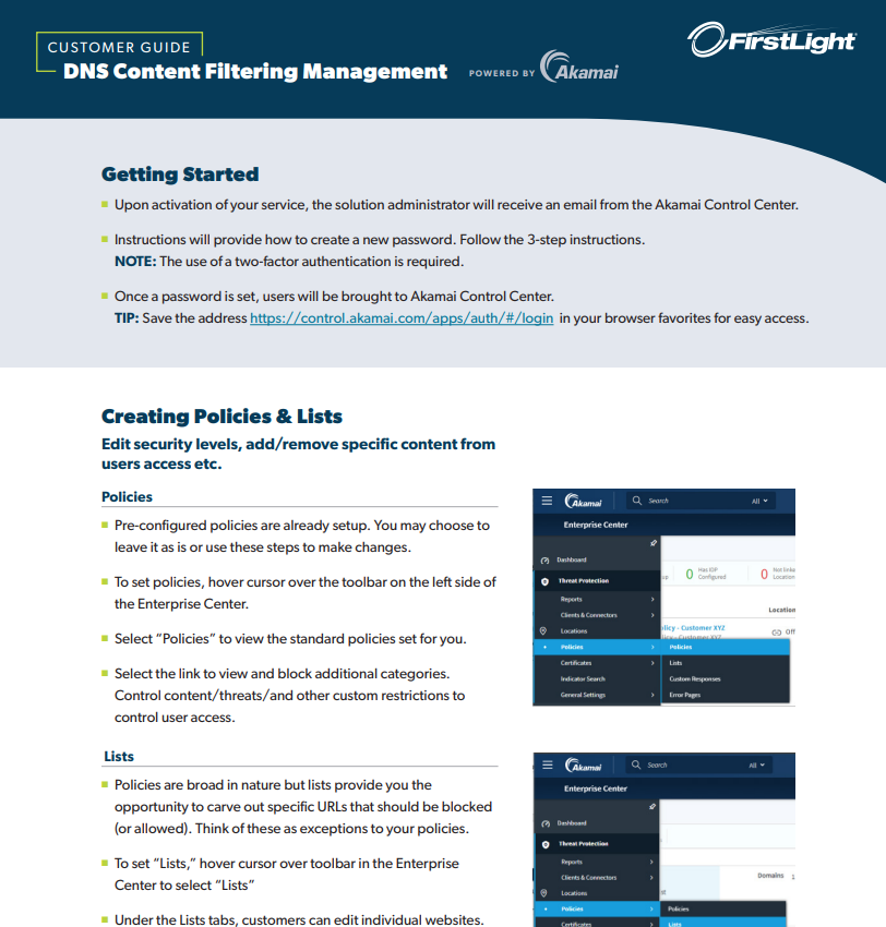 Guide for admins to set policies, manage lists, add locations, and monitor activity using FirstLight’s DNS Content Filtering service (powered by Akamai)