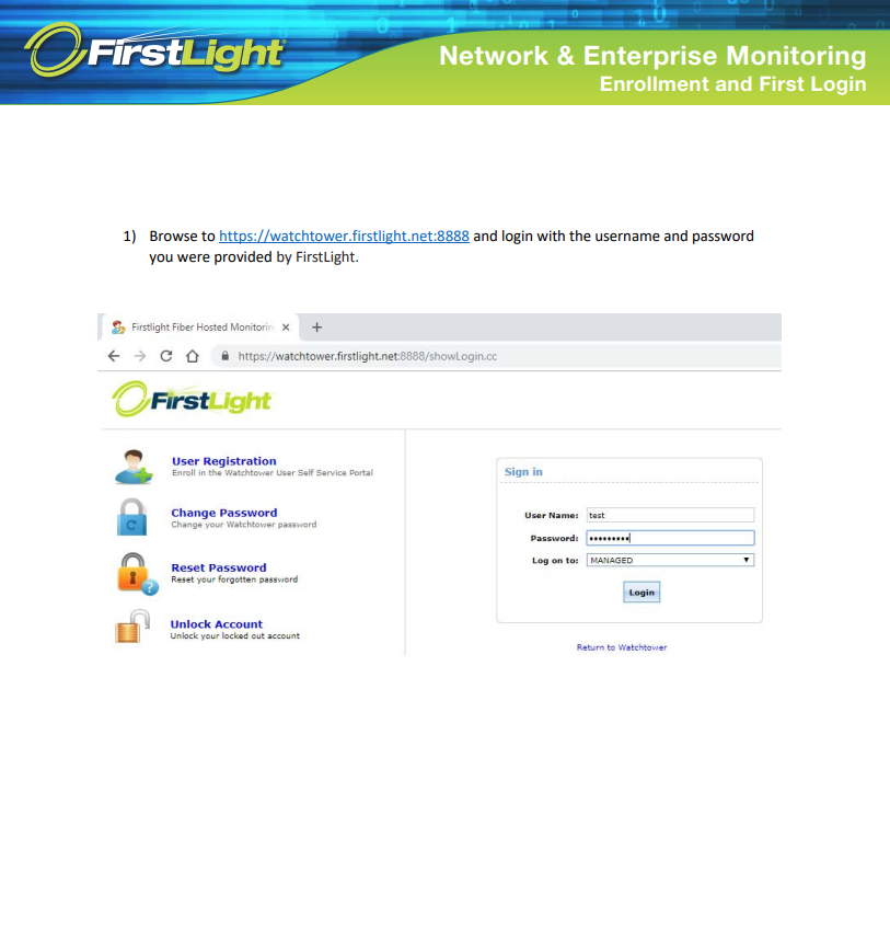 Step-by-step instructions for enrolling in FirstLight’s hosted monitoring system and completing your first login
